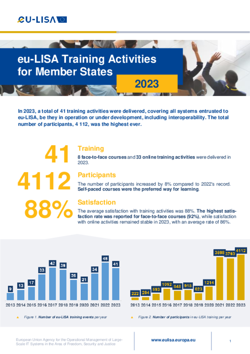 In close cooperation with the National Contact Point (NCP) network, the Agency aligns its training activities to the needs of the Member States. The NCP Network actively contributes to the process of establishing training needs through an annual Training Needs Assessment exercise, and supports eu-LISA in the development and updating of training courses, methodologies, materials and tools.