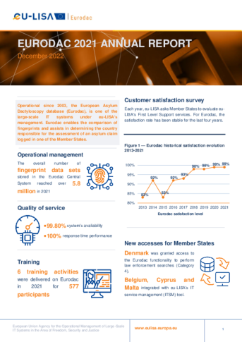 This annual report comprises the technical functioning of the Eurodac central system in 2021. It covers the operational management activities carried out by eu-LISA, as well as an overview of statistical data generated at central level on the usage by Member States.