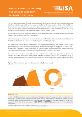 Eurodac is the centralised European database that stores and processes the digitalised fingerprints of asylum seekers and irregular migrants who have entered a European country. This helps determine the Member State responsible for examining an asylum application. Eurodac stands for EUROpean Asylum DACtyloscopy database. Pursuant to Article 8(2) of Regulation (EU) No 603/2013, at the end of each year eu-LISA